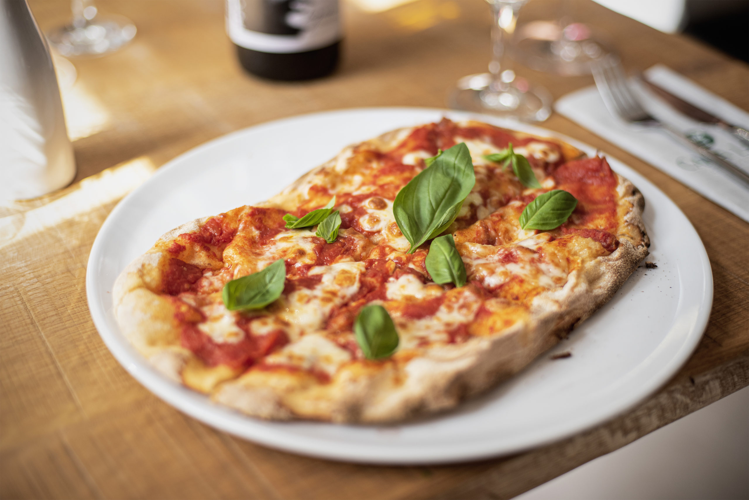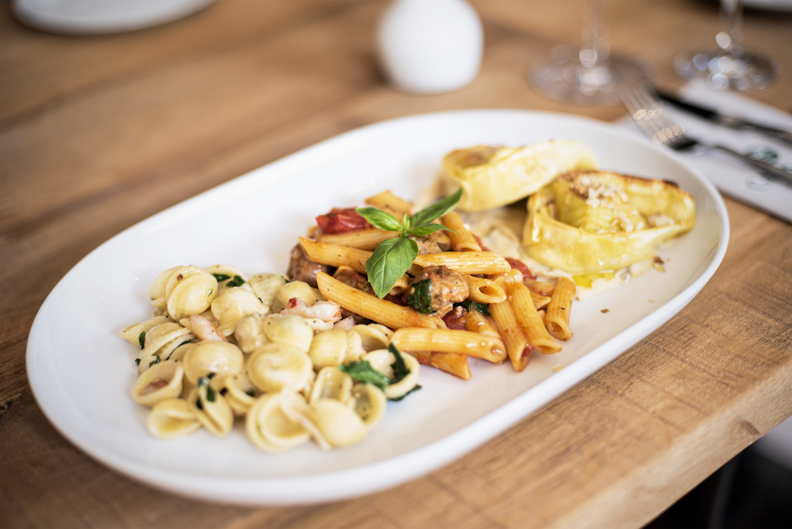 Was das Wichtigste an einem Restaurant angeht, das Essen, können die Gäste der Casa Leo ebenfalls Außergewöhnliches erwarten. Bei unserem Testessen übertraf sich Koch und Inhaber Michele Del Nobile mit jedem Gang von neuem. Ob Antipasti, Nudelgerichte oder italienische Burger – alles Kochkunst auf höchstem Niveau. „Bei uns wird alles frisch zubereitet“, betont Geschäftsführer Daniele Sancillo. „Die Pasta stellt eine italienische Familie hier in Deutschland von Hand her. Das Fleisch für Burger und Salsiccia kaufen wir auf dem Willicher Stautenhof und das hat Top-Bioqualität“, freut er sich. „Statt Pizza servieren wir unseren Gästen ‚Pinsa‘ – ein traditionelles Teigprodukt aus Weizen-, Reis und Sojamehl, das viel Zeit zum Reifen bekommt. Dadurch wird der Teig angenehm locker und leicht bekömmlich.“