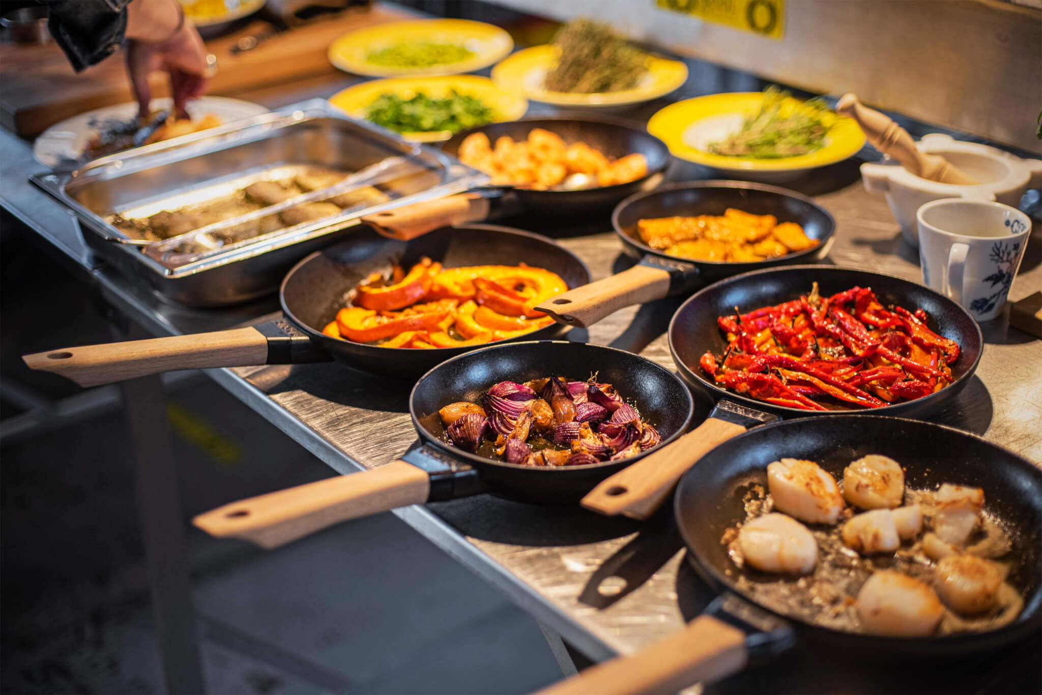 Den Detailreichtum der cuisine m. in Gänze zu beschreiben ist schier unmöglich – es sei denn, man wollte allein mit Michael Uhlemanns Händchen für Einrichtung mehrere Seiten füllen – also kommen wir zurück zur Person. Und zum Essen. Denn dafür sind wir heute hier, und Michael, den seine Freunde liebevoll „Micky“ nennen, hat schon einiges vorbereitet: Auf der Arbeitsfläche stehen Edamame-Bohnen, frische Kräuter, Jakobsmuscheln, Gambas, Wolfsbarschfilets und in Öl eingelegtes Gemüse in Porzellanschalen und Edelstahlformen bereit.