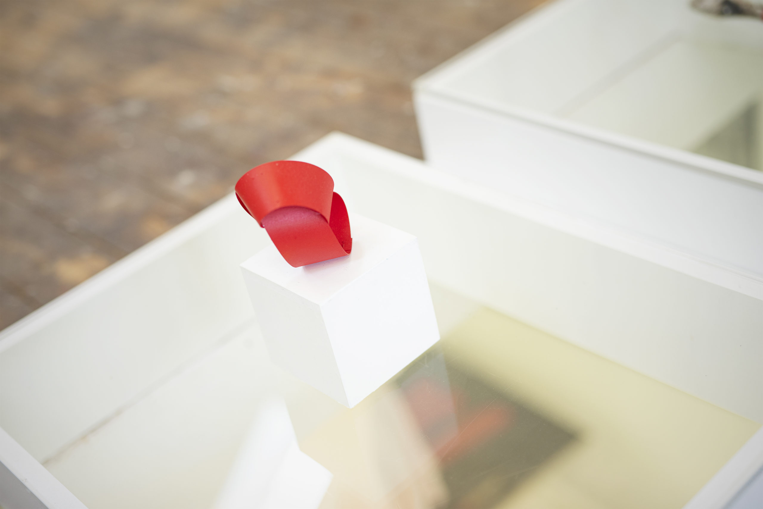 Auch bei ihren kleineren Arbeiten setzt Edith Stefelmanns auf klare Farben und geometrische Formen. Im Laufe der Zeit haben sich dabei die von ihr eingesetzten Materialien verändert. So hat sie kürzlich eine Serie mit Miniaturen in Lack auf Folie entworfen, die sich durch unterschiedliche Faltungen auszeichnen. „Formen, Farben und Proportionen sind Grundelemente meiner Werke. Sie werden in Bezug zueinander gebracht. Strenge Konzeption ist verwoben mit der autonomen Kraft der bildnerischen Mittel“, erklärt sie ihr künstlerisches Prinzip. „Zuerst wächst die Idee in mir, dann bringt der kreative Fluss sie ins entsprechende Material, das ich mit Respekt und dem Wunsch nach Präzision und Perfektion bearbeite“, sagt Stefelmanns. „In jedes Werk fließt mein gesamtes Leben mit all seinen Erfahrungen ein. Daraus schaffe erstelle ich eine Gleichung, und auf deren rechter Seite steht: Kunst.“