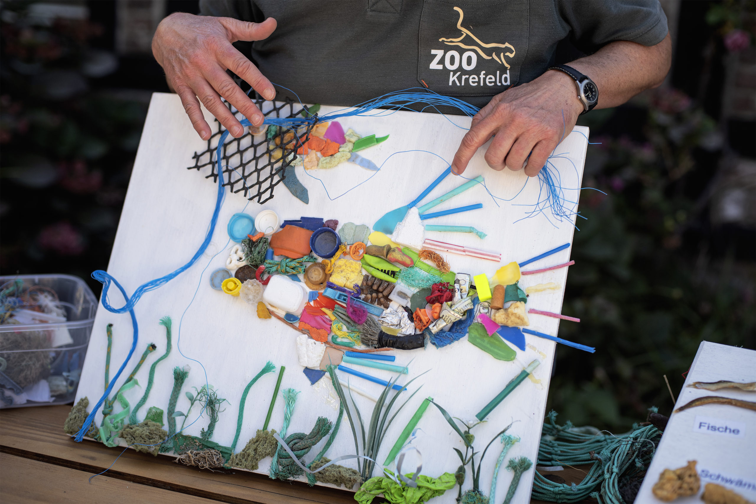 Fast 40 Plastikteile hat ein Eissturmvogel im Durschnitt im Magen. Auf unseren Körper umgerechnet, würde diese Menge einer sehr großen Brotdose entsprechen. Dass im Meer ein enormes Müllproblem herrscht, war dem elfjährigen Tobias bewusst, dass es sich aber so stark auf die Tiere auswirkt, hat der Schüler nicht geahnt. Ungläubig steht er vor Gaby Borg aus dem Forscherhaus des Krefelder Zoos und betrachtet immer wieder die Nahrungskette der Meerestiere, die die Biologin anschaulich zusammengestellt hat. „Strohhalme möchte ich auf jeden Fall nicht mehr benutzen“, erklärt Tobias und schüttelt den Kopf: „Darüber muss ich mal mit Mama und Papa sprechen.“