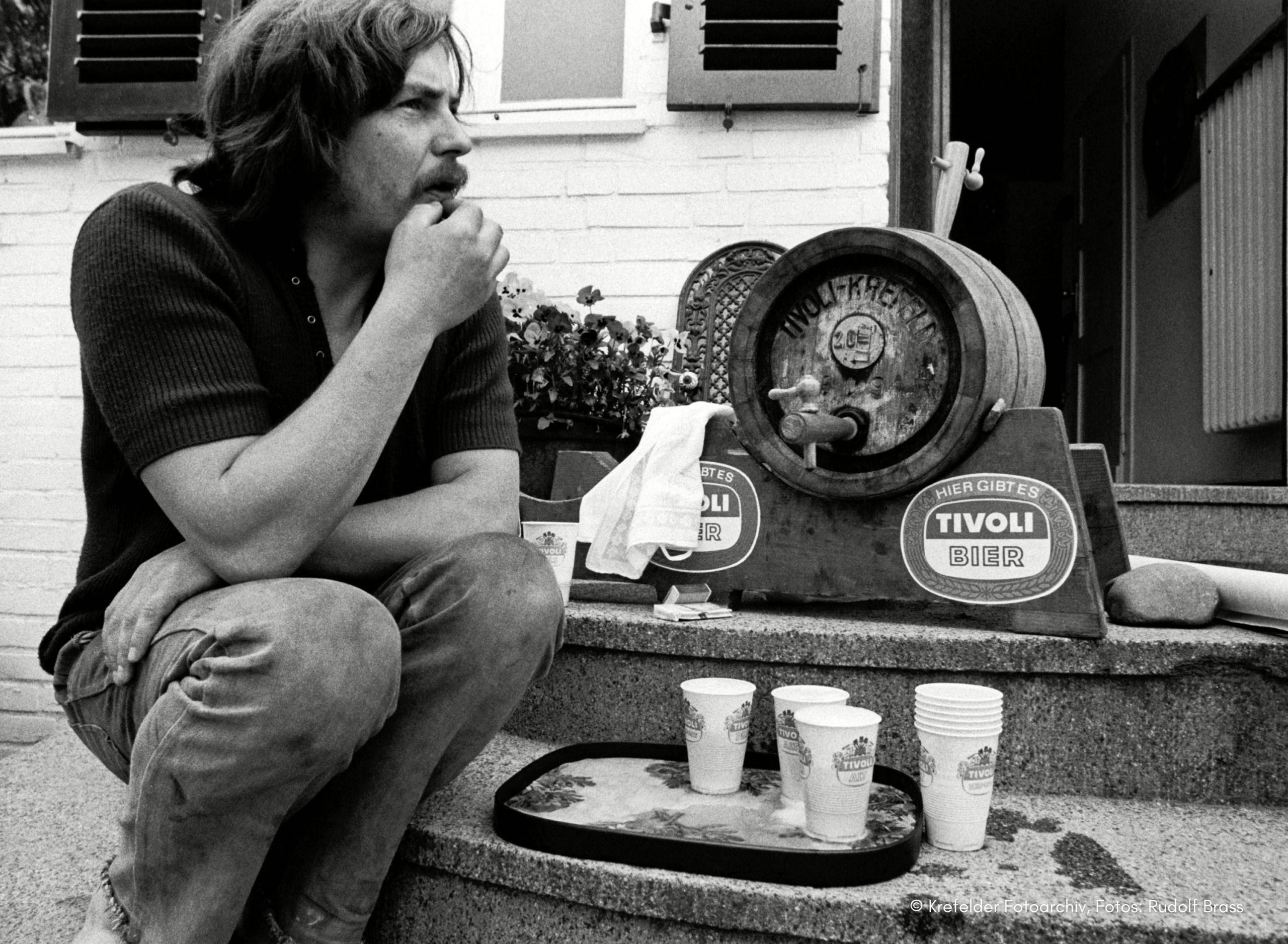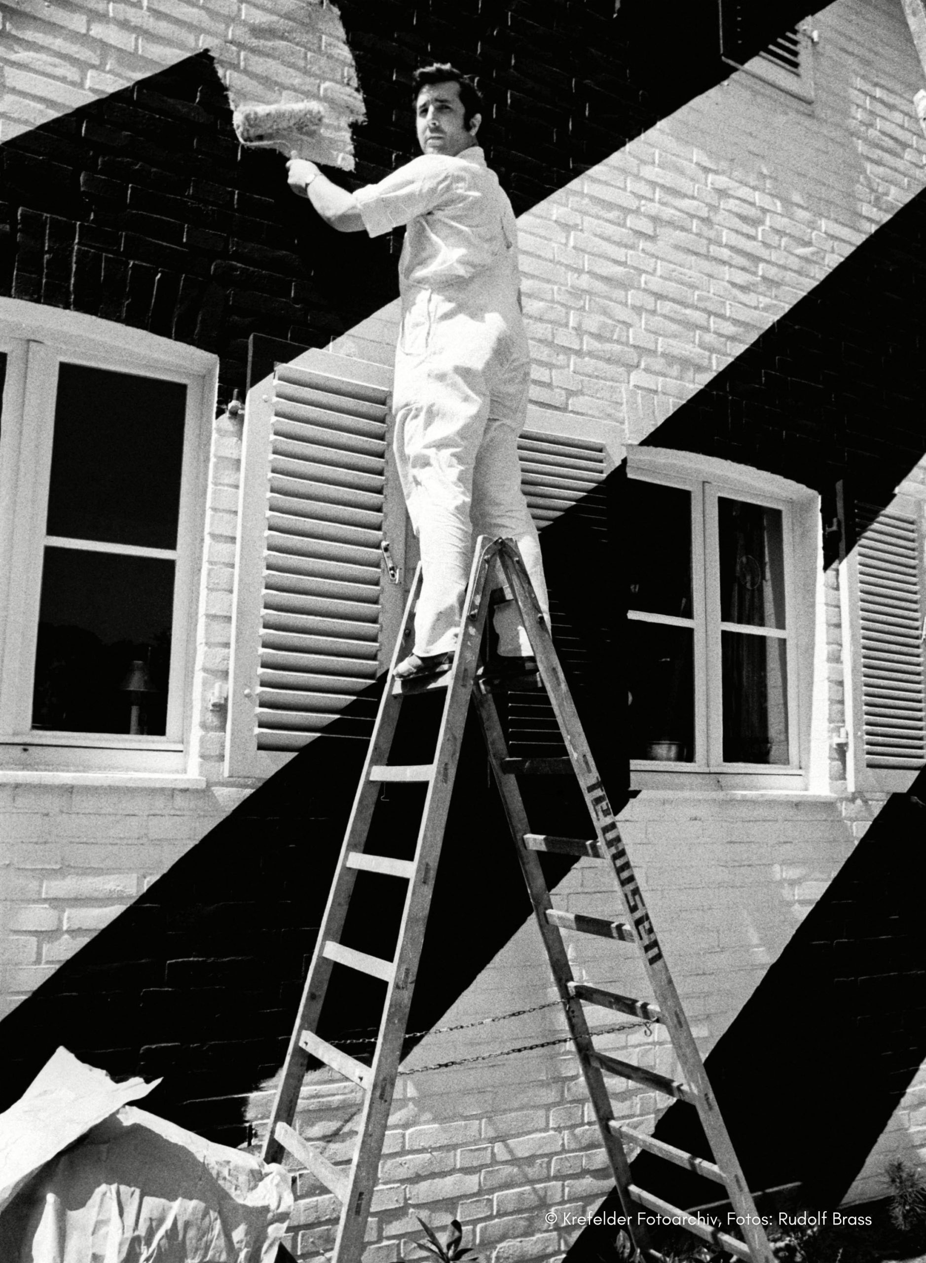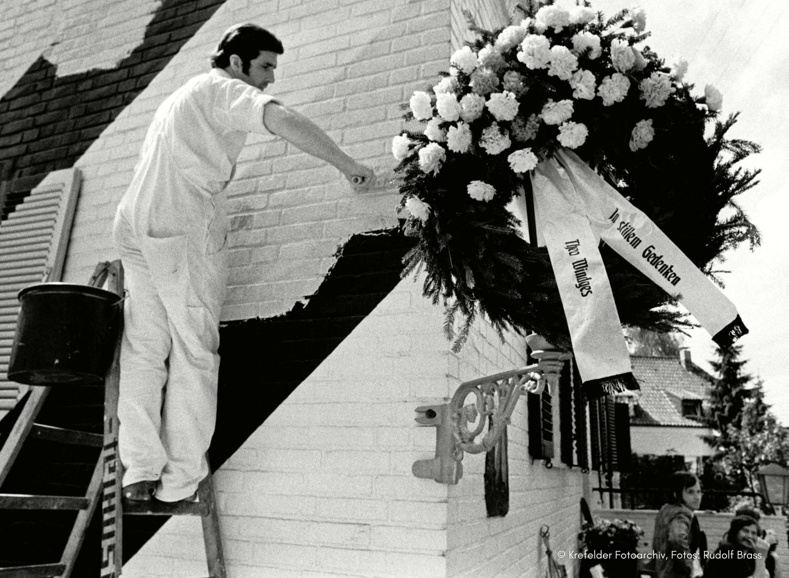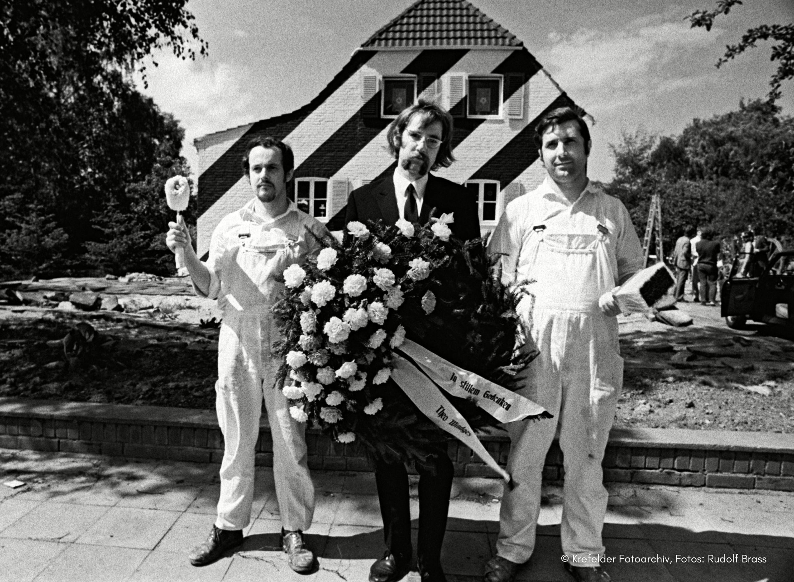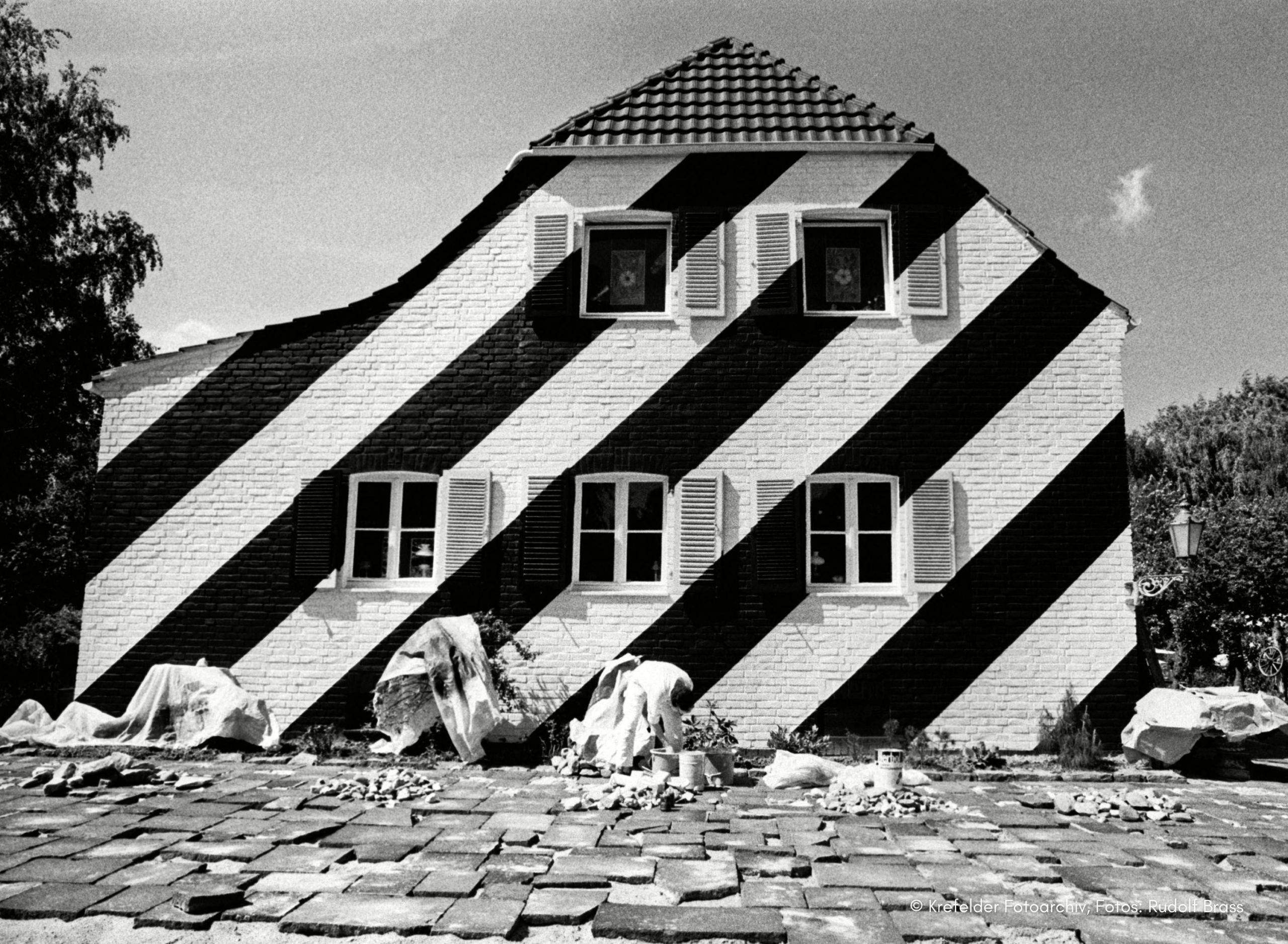 Beim Durchstöbern alter Fotoarchive findet man die ulkigsten Dinge. Ein solches Motiv weckte kürzlich meine Aufmerksamkeit: Ein Mann in Schwarz steht mit großem Sargkranz im Arm vor dem Schwarz-Weiß-Haus an der Moerser Straße. Links und rechts neben ihm zwei weiß gekleidete Anstreicher mit Pinsel und Farbrolle in der Hand. Wie ist denn das nun zu verstehen? Als ich den langjährigen Hausherren Hans-Dieter Oelgart spontan anrufe und auf die Bilder anspreche, weiß er sofort, was ich da gefunden habe: „Ja, dazu kann ich Ihnen was erzählen“, verspricht er amüsiert. Und eine Woche später darf ich erfahren, was die skurrile Szene zu bedeuten hat. Die Überstreichung der charakteristischen schwarzen Streifen des Wohnhauses und Antiquariats war seinerzeit Politikum und Presse-Hit in einem. Wie die Stadt dem Ehepaar Oelgart „gegen den Strich“ ging und warum das Streifenhaus heute nach wie vor seine auffällig Fassade zeigen darf, sei hier kurz erzählt: