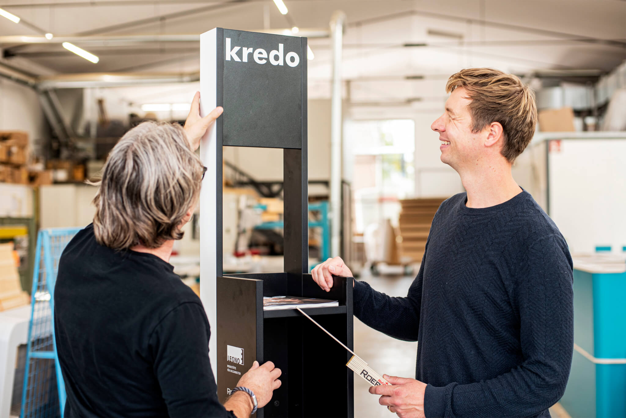 Auch unsere neuen kredo-Aufsteller, die aktuell an 60 Standorten im gesamten Stadtgebiet zu finden sind, stammen aus dem Hause LEGNO – und wurden von Max Muctar in Zusammenarbeit mit unserem Herausgeber Christhard Ulonska entworfen. So konnten wir uns selbst von der familiären und kompetenten Arbeitsweise des Unternehmens überzeugen: Begeistert hat uns hierbei vor allem die unkomplizierte Zusammenarbeit und das Gefühl, als Kunde direkt in den Entstehungsprozess einbezogen zu werden. Das sorgt für reibungslose Abläufe und sichert gleichzeitig eine ressourcensparende Produktion. „Die Zufriedenheit unserer Kunden ist uns natürlich sehr wichtig. Deshalb erhalten sie nach dem Beratungs- und Planungsgespräch eine virtuelle 3D-Zeichnung ihres Projekts. So weiß jeder genau, was er bekommt“, erläutert Geschäftsführer Max Muctar. „Zudem können die wenigsten Kunden etwas mit einer technischen Zeichnung anfangen. Die 3D-Modelle hingehen sind anschaulich und werden später auch für unsere Fertigung genutzt. Das Programm ist mit unserer Zuschnittsäge vernetzt. Zwischengeschaltet ist ein Optimierungsprogramm, das genau berechnet, wie die Schnittmuster optimal aus den großen Platten ausgesägt werden müssen, um möglichst wenig Abfall zu produzieren. So vermeiden wir unnötigen Ausschuss.“