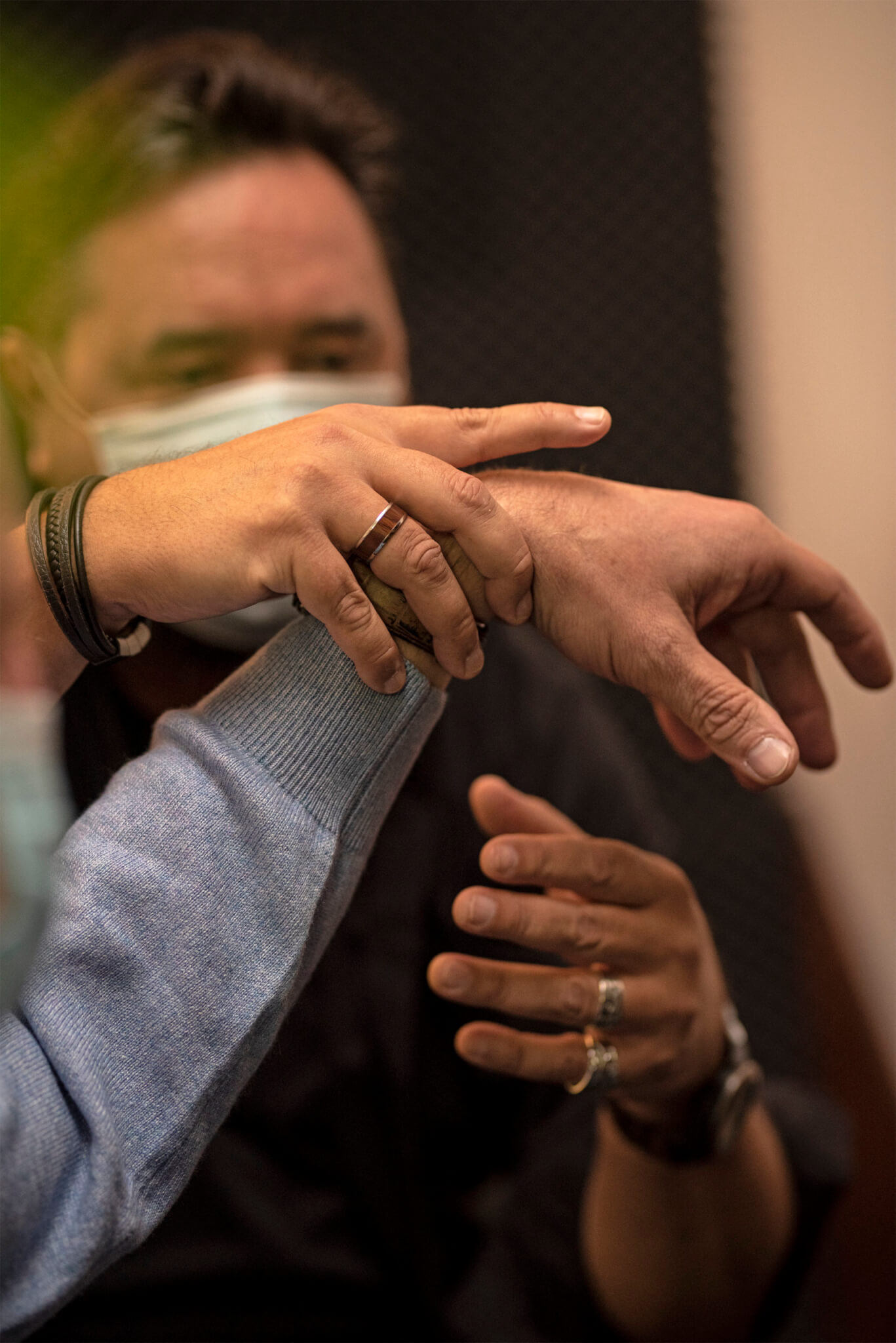 Im nächsten Augenblick richtet sich genau dieser Fokus wieder auf den Arm, der diesmal waagerecht und mit geballter Faust ausgestreckt ist. Alle verfügbaren Energien konzentrieren sich nun auf die komplette Anspannung des Arms bis in jede Muskelfaser hinein. Immer und immer wieder erreichen es die eindringlichen Worte, dass der Arm mitsamt Faust zunehmend unbeweglicher – wird bis zur völligen Erstarrung. Quasi wie aus Stahl gegossen.