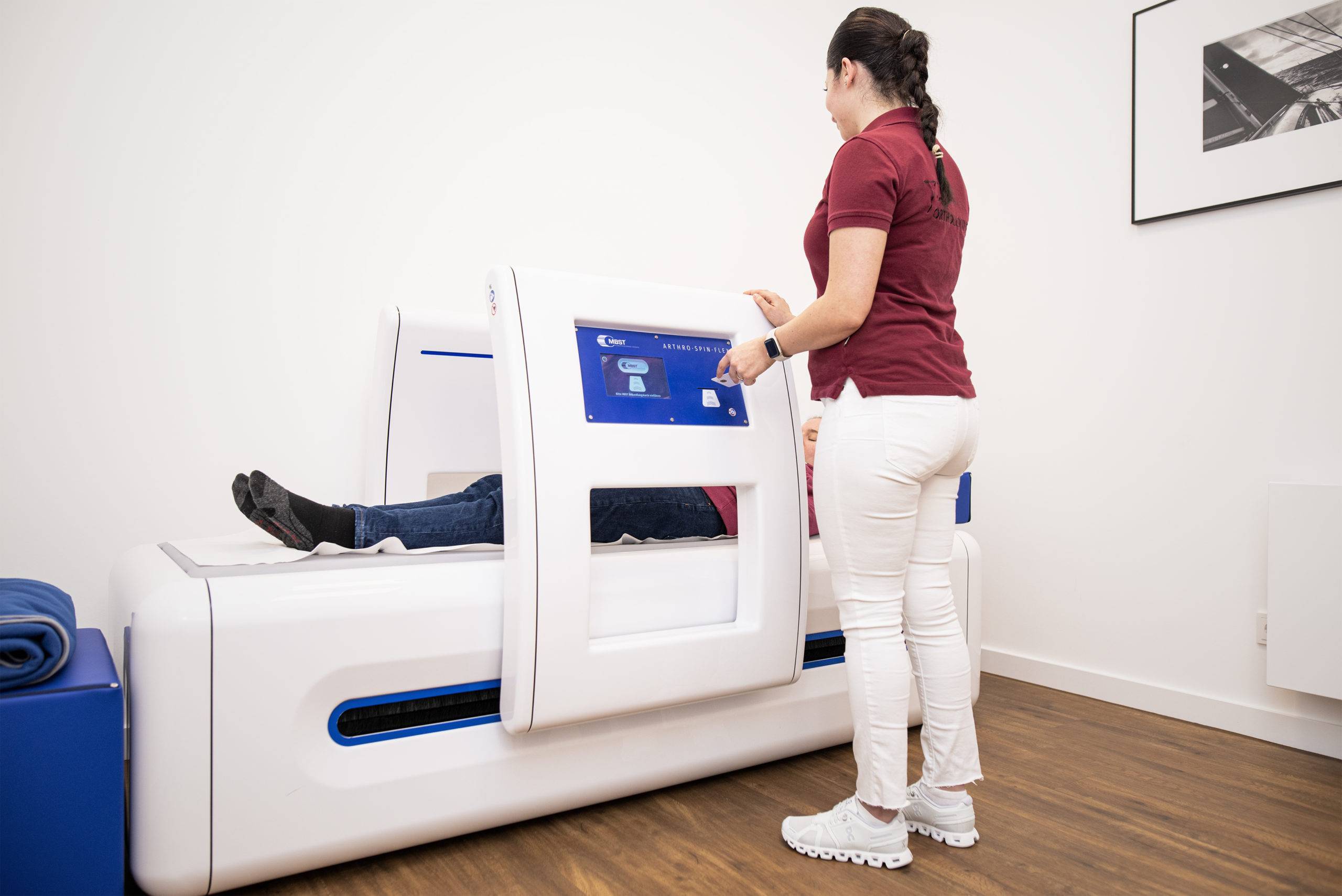 Ein weiteres Highlight der Privatpraxis liegt im Einsatz der MBST® Kernspinresonanz-Therapie. „Die Abkürzung steht für Multi-Bio-Signal-Therapie“, erläutert Dr. Sinan Yücel, der im Rahmen seiner Dissertation zum wissenschaftlichen und medizinischen Einsatz der Magnetfeldtherapie geforscht hat und daher besondere Expertise auf diesem Behandlungsgebiet von Arthrose und anderen degenerativen Erkrankungen des Stütz- und Bewegungsapparates vorweisen kann. Die Funktionsweise lasse sich als Schlüssel-Loch-Prinzip veranschaulichen, beschreibt er fachkundig: „Drei relativ schwache Magnetfelder werden elektrisch erzeugt und wirken zusammen. Die dadurch entstehende Energie wird auf Wasserstoffkerne und anschließend auf das kranke Gewebe übertragen. Damit tritt ein therapeutischer, heilender und ebenso symptomatischer, schmerzreduzierender Effekt auf Knochen, Knorpel, Sehen und Bänder ein. Hauptindikationen dieser vollkommen nebenwirkungsfreien Therapie sind Arthrose, Verletzungen und Überbelastungen von Sehnen und Bändern sowie Osteoporose.“