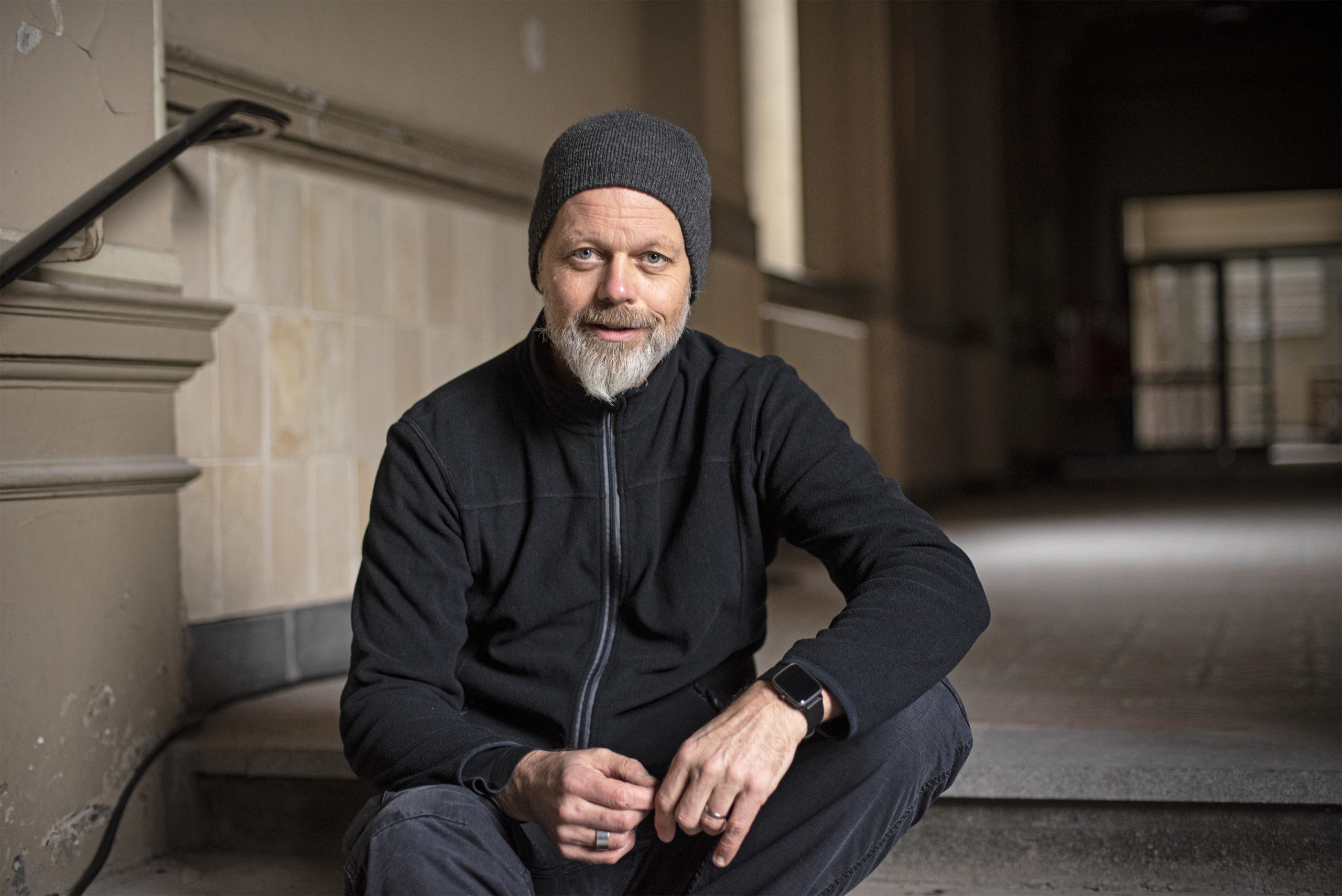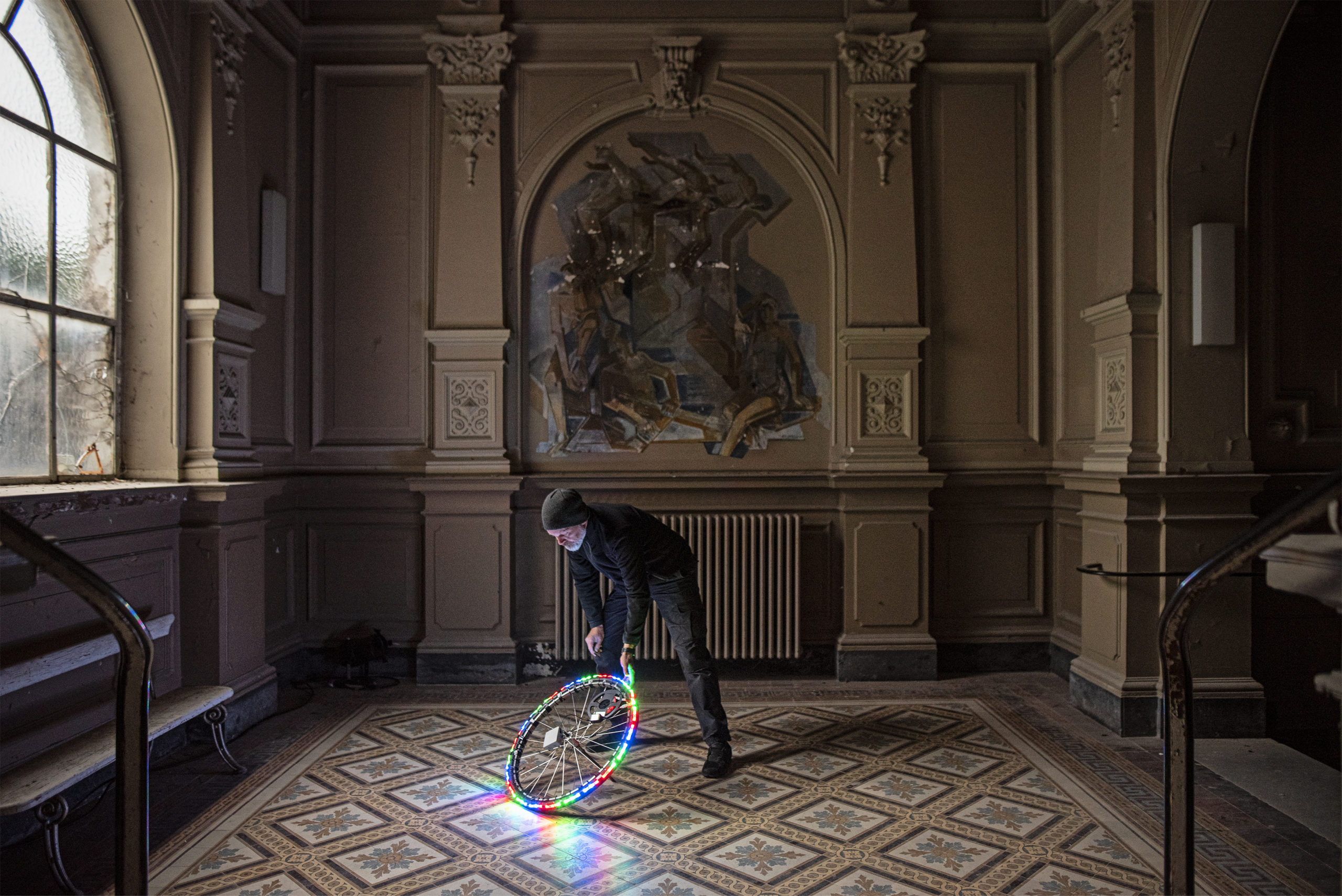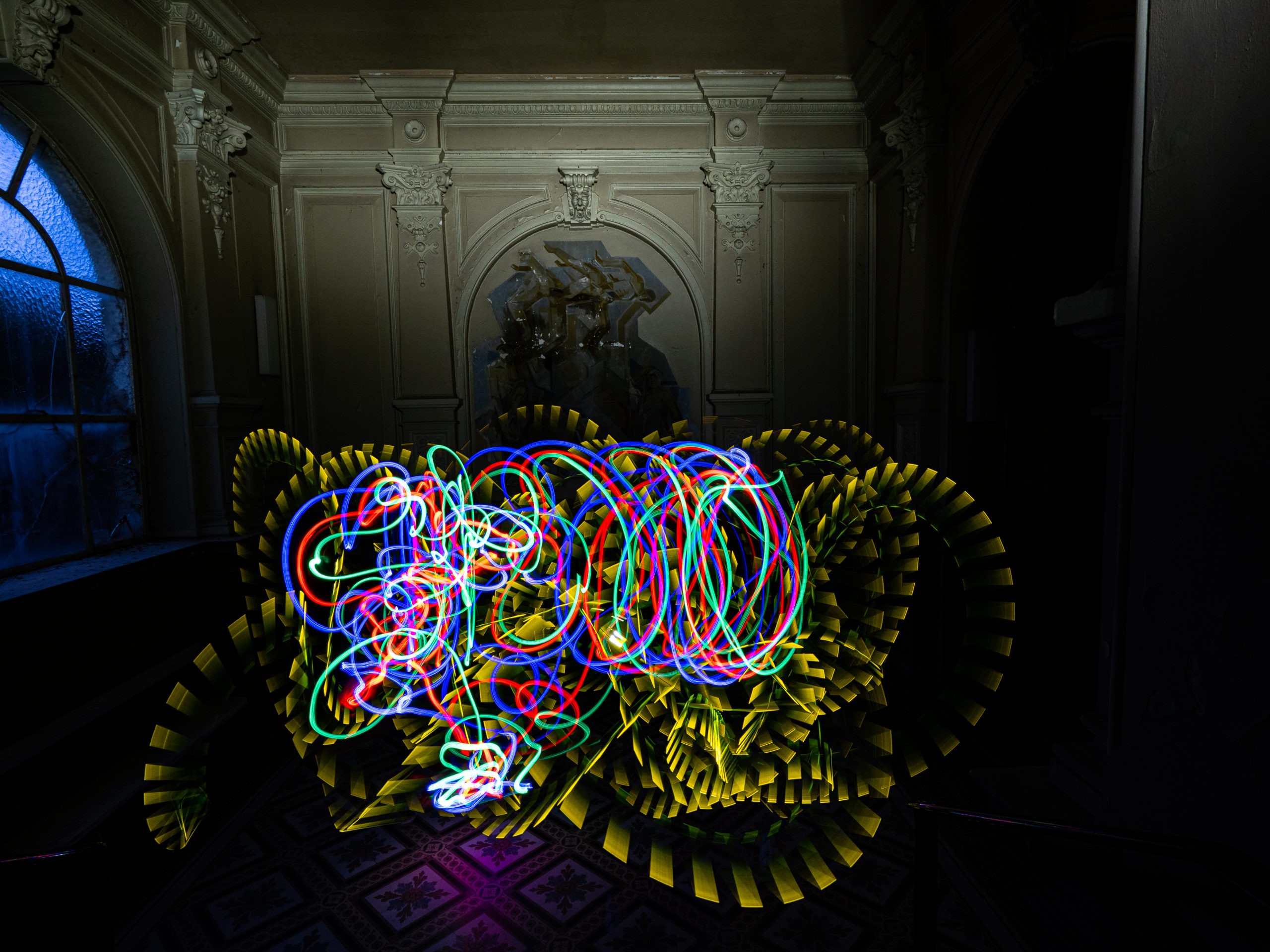 Gleich wird es im alten Stadtbad an der Neusser Straße stockduster sein. Das Auge sieht nur Schemen in der Dämmerung. Es ist ein Mittwochabend im Herbst. Der erste richtig kalte Tag in diesem Jahr. Eine Kamera steht, ausgerichtet auf den großzügigen Absatz der Haupttreppe, in dem mehr als 100 Jahre alten Gebäude und fokussiert auf den großen, vollständig in Schwarz gekleideten, schlanken Mann. Rainer Moll hat ein kurioses Gadget in der Hand, einen Lichtstift, den er jetzt anknipst. Er bewegt ihn ruhig und konzentriert durchs Dunkel. Auf dem Display der Kamera entstehen Linien. Nach und nach, Stück für Stück, baut sich ein leuchtendes Muster auf. „Life Composit Modus“ nennt sich diese besondere Technik, in der das Bild von der Kamera bei Langzeitbelichtung alle drei Sekunden neu zusammengesetzt wird und es so ermöglicht, jeden Bewegungsabschnitt, den Rainer mit seinen Lichtern vollführt, als illuminierten Pinselstrich festzuhalten. Er selbst ist auf dem Bild nicht zu sehen. Dafür sorgt seine schwarze Kleidung.