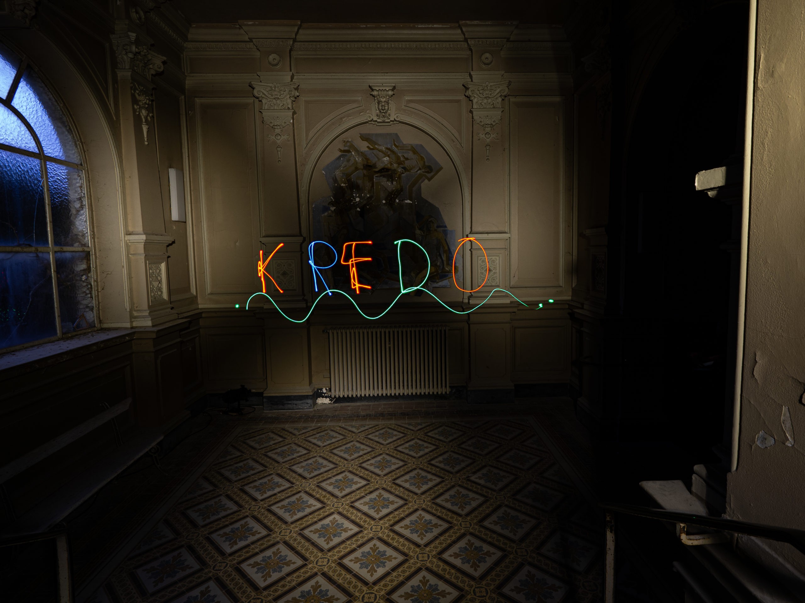 Im dunklen Stadtbad sind derweil erste Motive entstanden: quallenartige Lichtkegel, eine mehrfarbige Komposition, die ein wenig an Musiknoten erinnert und ein bunter kredo-Schriftzug. Gerade die Buchstaben sind eine Herausforderung. „Es ist schon viel Übung gefragt“, gibt Rainer zu. „Du musst möglichst in einem Rutsch malen, weil du sonst den Anschluss nicht mehr findest.“ Generell sollte man beim Lightpainting sehr konzentriert vorgehen, um ärgerliche Missgeschicke zu vermeiden. Denn in ein einziges Bild fließen viel Bewegung und Überlegung. „Man muss bei diesem speziellen Kameramodus immer zweimal auslösen. Es ist mir schon passiert, dass ich nur einmal draufgedrückt habe. Dann habe ich ein sehr komplexes Bild gemacht, und als ich aufs Display geguckt habe, stand dort immer noch ‚Bereit für Aufnahme‘“, erzählt Rainer und schmunzelt.
