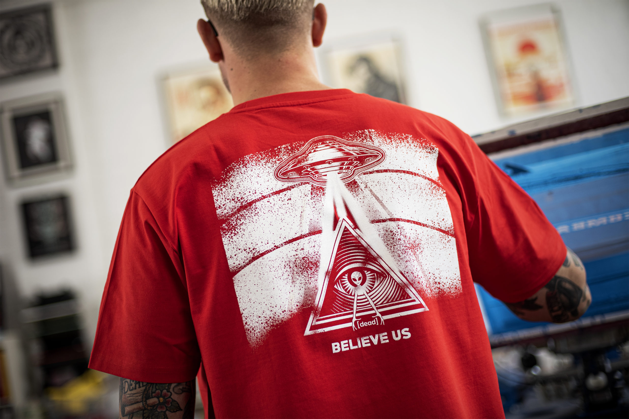 „Die Arbeitsabläufe sind eigentlich so, dass ich Holger täglich auf allen Kanälen mit neuen Ideen bombardiere“, erzählt der Charakterkopf laut lachend. „Seine Rolle ist dann, meine Ideen in fertige Designs umzuwandeln.“ So entstehen zusammenhängende Kollektionen, aber auch einzelne Drops. „Wir haben uns zum Beispiel vor einigen Wochen über die Verschwörungstheoretiker lustig gemacht und dachten, dass man das doch cool auf einem Shirt oder Shorts thematisieren könnte“, erinnert sich Holger. Kurze Zeit später erscheint eine Shorts mit einem Alienkopf und ein Shirt mit einem verschwörerischen Auge, einem landenden UFO und den Lettern „Believe Us“. Oft gibt es die Designs nur in begrenzter Stückzahl, und sie sind innerhalb weniger Tage ausverkauft. „Das schafft natürlich auch Anreiz für Leute, die die Arbeit von Dead Stuff verfolgen“, erklärt Christopher mit einem bübischen Lächeln. Und Holger ergänzt: „Wir sind uns schon darüber bewusst, dass das eine Ehre ist, als kleines Label damit Geld zu verdienen. Christopher und ich haben uns quasi gesucht und gefunden.“